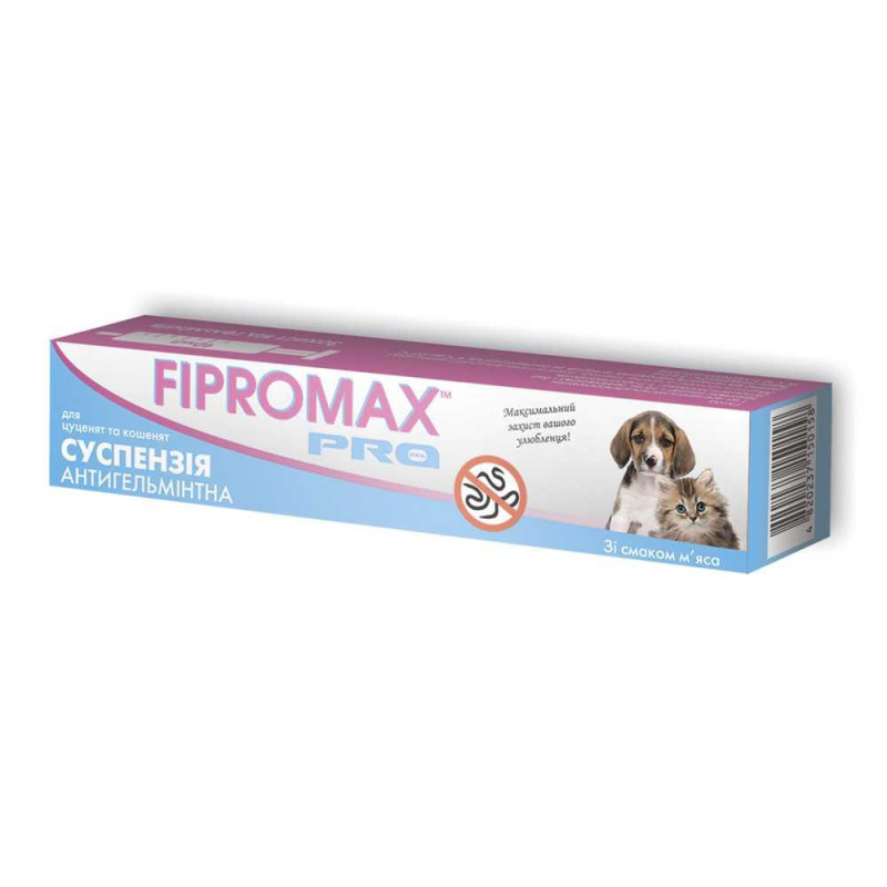 [1]Суспензія від глистів для кошенят та цуценят зі смаком м'яса, 10 мл, Fipromax PRO   FIPROMAX PRO - антигельмінтики, що відрізняються високою ефективністю, дозволяють позбавити вашего улюбленця від паразитів вже після першого застосуванняСклад: 1 мл препарату: пірантелу памоат  - 15 мг, празіквантел - 5мг.Допоміжні речовини: 1,2 -пропіленглікольСклад: 1 мл препарату: пірантелу памоат  - 15 мг, празіквантел - 5мг.Допоміжні речовини: 1,2 -пропіленгліколь