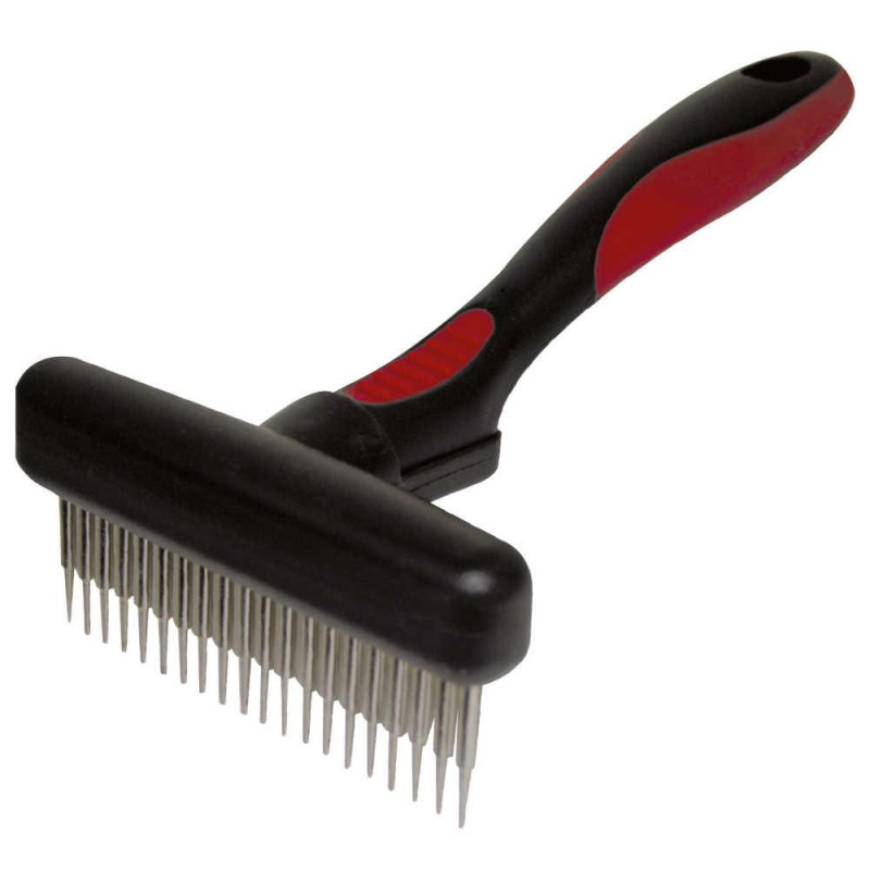 [1]Зручний Гребінець-граблі для собак і котів Vanity Magic Rake Combs CROCI з 20 довгими зубцями, 11 х 17 см см з металевими зубцями, що амортизують, для розчісування та розплутування ковтунів у собак із середньою та довгою шерстю, надання їй м'якості та пухнастості, а також видалення мертвого волоссяДопомагає дбайливо розчісувати шерсть тварини, розділяючи волоски між собою, що дає змогу ефективно розплутувати ковтуниЗавдяки спеціальній пружинній системі зуби адаптуються до форми тіла тварини, що дає змогу розчісувати без стресу.Крім того, зуби, що обертаються на 360°, не рвуть вузли, забезпечуючи просте і приємне розчісування.За щоденного використання запобігає сплутуванню шерсті та покращує кровообіг у клітинах шкіриОснащений закругленими зубцями з хромованої неіржавкої сталі, щоб не травмувати шкіру і не завдавати дискомфорту тварині під час вичісуванняНайкраще підходить для вичісування тварин із середньою та довгою шерстюПластикова ручка забезпечує зручне утримання інструменту в руці