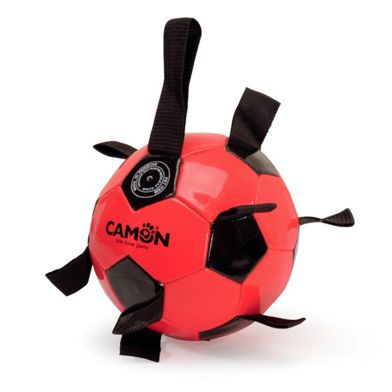 Іграшка для собак CAMON м'яч футбольний з ПВХ розмір 5 з поліестеровими ручками, чорний/червоний, 21 см