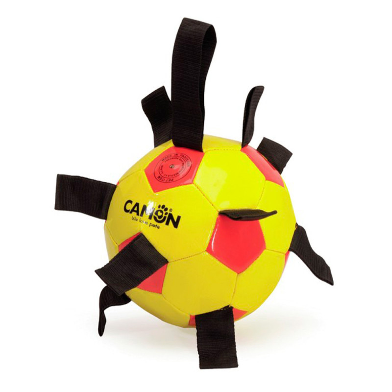 Про товар Іграшка для собак CAMON м'яч футбольний з ПВХ розмір 5 з поліестеровими ручками, жовто/червоний, 21 см