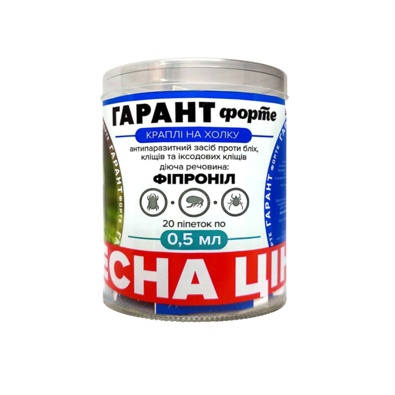 Про товар Краплі Гарант Форте від бліх та кліщів для котів та собак до 2 кг (0,5 мл), 20 шт (фіпроніл)/15
