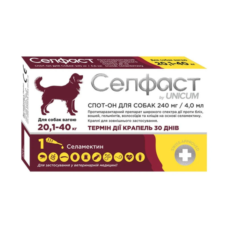 Селфаст Unicum — це протипаразитарний лікарський засіб, призначений для собак і кішок. Основна діюча речовина — селамектин, що володіє широким спектром дії: ефективно бореться з нематодами, комахами та саркоптоїдними кліщами, які паразитують у домашніх тварин. Він також має ларвіцидні та овоцидні властивості, перериваючи цикл розвитку паразитів.