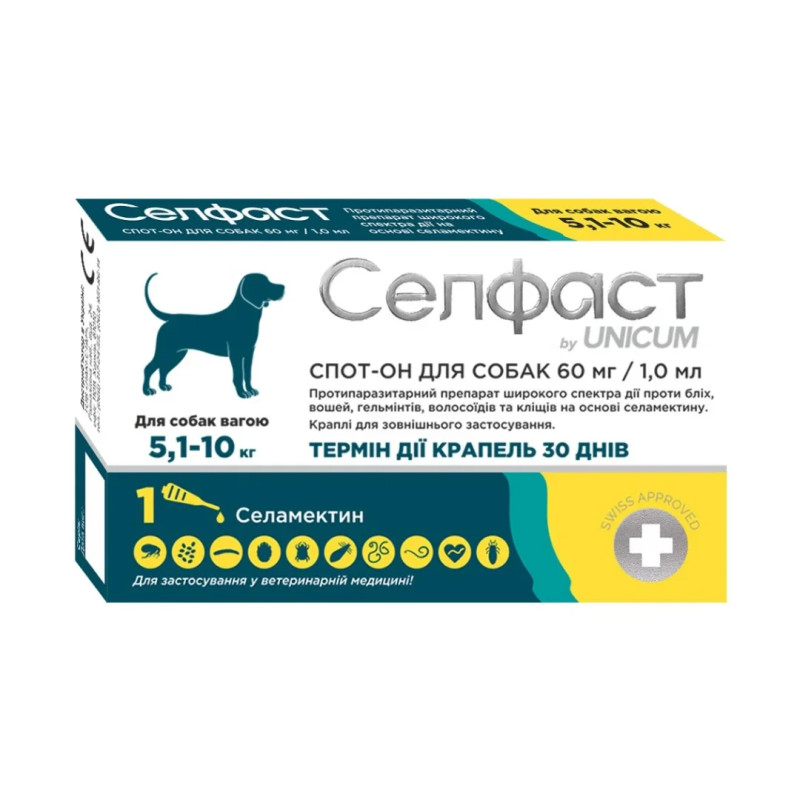 Селфаст Unicum — це протипаразитарний лікарський засіб, призначений для собак і кішок. Основна діюча речовина — селамектин, що володіє широким спектром дії: ефективно бореться з нематодами, комахами та саркоптоїдними кліщами, які паразитують у домашніх тварин. Він також має ларвіцидні та овоцидні властивості, перериваючи цикл розвитку паразитів.