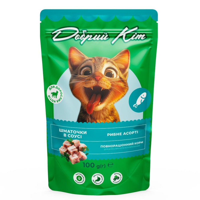 Повнораціонне вологе харчування для дорослих котів із шматочками риби у ніжному соусі. Забезпечує організм тварини білками, вітамінами D₃, Е та необхідним таурином для підтримання здоров’я серця, зору й активності. Має привабливий аромат і чудовий смак, який сподобається навіть вибагливим котам.Натуральна риба у складіТаурин для здоров’я серцяВітаміни для імунітетуЗручна порційна упаковка — пауч 100 гСклад: м'ясо та продукти тваринного походження — не менше 73% у шматочках (зокрема: з курки – 45%, з яловичини – 20%, з качки – 8%), злаки. Шматочки становлять не менше 45%.Технологічні добавки: гуарова камедь, ксантанова камедь, декстроза.Поживні добавки (на 1 кг корму):таурин (3а370) – 225 мг.Вітамінно-мінеральний комплекс:вітамін D3 (3а671) – 75 МО,вітамін Е (3а700) – 22,5 мг,вітамін В1 (3а821) – 2,2 мг,вітамін В2 (3а825і) – 1,6 мг,вітамін В6 (3а831) – 1,2 мг,вітамін В12 – 11,2 мкг,ніацинамід (3а315) – 15 мг,кальцію-D-пантотенат (3а841) – 3,7 мг,фолієва кислота (3а316) – 0,4 мг,біотин (3а880) – 30 мкг.Мікроелементи:залізо (3b103) – 13,5 мг,мідь (3b405) – 1,0 мг,кремній (Е551а) – 15 мг,цинк (3b605) – 12,5 мг,марганець (3b502) – 1,0 мг,йод (3b202) – 0,22 мг.Вміст вологи: 82,0%.Енергетична цінність (калорійність) на 100 г корму: 336,5 кДж / 80,4 ккал.Поживна цінність (аналітичний склад):сирий протеїн – 6,6%,сирий жир – 4,0%,сыра зола – 1,3%,сыра клітковина – 0,4%.Для дорослих котів усіх порід віком від 1 року.Рекомендації щодо годування: норма годування може змінюватися залежно від віку, рівня активності та середовища перебування тварини. Порція корму повинна бути кімнатної температури. Корм необхідно вводити в раціон поступово (протягом перших 5 днів). Свіжа питна вода повинна бути доступна тварині у будь-який час.Умови зберігання закритого корму: зберігати в чистому, добре вентильованому приміщенні за температури від 0°C до +25°C та відносної вологості повітря не вище 75%.Умови зберігання відкритого корму: зберігати в холодильнику не довше 48 годин.Строк придатності: 24 місяці від дати виробництва. Дата виробництва та дата «Вжити до» зазначені на пакуванні.