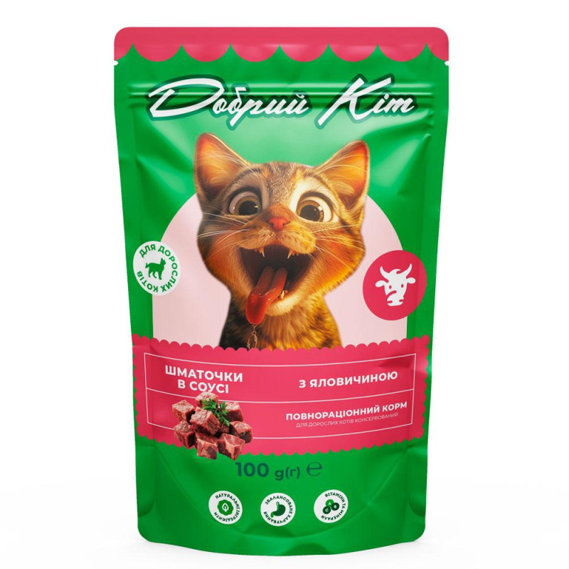Повнораціонне вологе харчування для дорослих котів. Містить ніжні шматочки яловичини та курки у смачному соусі, що забезпечують тварину високоякісним білком, таурином і необхідними поживними речовинами для підтримки здоров’я серця, гарного зору та активності. Соковиті шматочки у паучі 100 г мають приємний аромат і легко засвоюються, навіть вибагливі коти оцінять смак.Збалансований склад: м’ясо та продукти тваринного походження не менше 73%, шматочки не менше 45%Вітаміни та мікроелементи: D₃, Е, В1, В2, В6, В12, ніацинамід, кальцію-D-пантотенат, фолієва кислота, біотин, залізо, мідь, цинк, марганець, йодТаурин: підтримка серця та зоруЗручна упаковка: пауч 100 гСклад:м'ясо та продукти тваринного походження — не менше 73% у шматочках (зокрема: з курки – 43%, з яловичини – 30%), злаки.Шматочки становлять не менше 45%.Технологічні добавки:гуарова камедь, ксантанова камедь, декстроза.Поживні добавки (на 1 кг корму):таурин (3а370) – 225 мг.Вітамінно-мінеральний комплекс:вітамін D3 (3а671) – 75 МО,вітамін Е (3а700) – 22,5 мг,вітамін В1 (3а821) – 2,2 мг,вітамін В2 (3а825і) – 1,6 мг,вітамін В6 (3а831) – 1,2 мг,вітамін В12 – 11,2 мкг,ніацинамід (3а315) – 15 мг,кальцію-D-пантотенат (3а841) – 3,7 мг,фолієва кислота (3а316) – 0,4 мг,біотин (3а880) – 30 мкг.Мікроелементи:залізо (3b103) – 13,5 мг,мідь (3b405) – 1,0 мг,кремній (Е551а) – 15 мг,цинк (3b605) – 12,5 мг,марганець (3b502) – 1,0 мг,йод (3b202) – 0,22 мг.Вміст вологи: 82,0%.Енергетична цінність на 100 г корму:346,7 кДж / 82,8 ккал.Поживна цінність (аналітичний склад):сирий протеїн – 6,9%,сирий жир – 4,1%,сира зола – 1,3%,сира клітковина – 0,3%.Для дорослих котів усіх порід віком від 1 року.Рекомендації щодо годування:норма годування може змінюватися залежно від віку, рівня активності та середовища перебування тварини.Порція корму повинна бути кімнатної температури.Корм необхідно вводити в раціон поступово (принаймні протягом перших 5 днів).Свіжа питна вода повинна бути доступна тварині у будь-який час.Умови зберігання закритого корму:зберігати в чистому, добре вентильованому приміщенні за температури від 0°C до +25°C та відносної вологості повітря не вище 75%.Умови зберігання відкритого корму:зберігати в холодильнику не довше 48 годин.Строк придатності:24 місяці від дати виробництва.Дата виробництва та дата «Вжити до» зазначені на пакуванні.