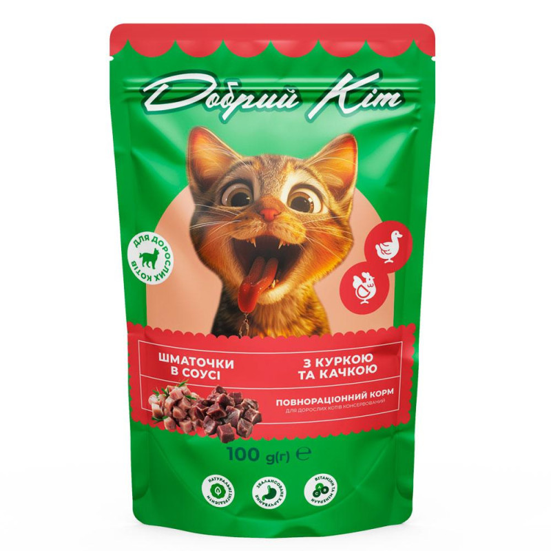 Про товар Корм Добрий Кіт для дорослих котів шматочки в соусі з куркою та качкою 100 г, пауч