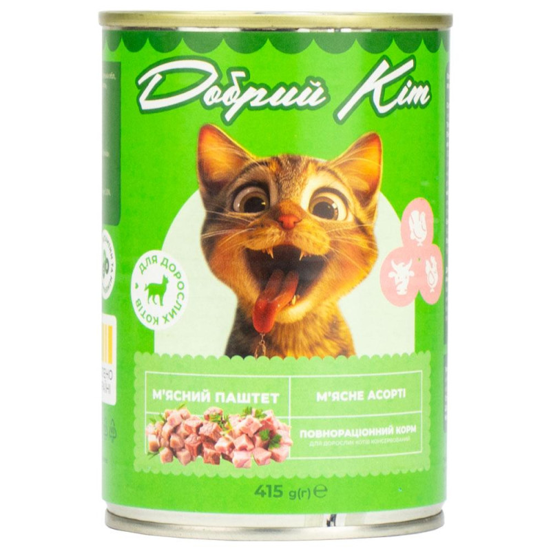[1]Повнораціонний корм для дорослих котів консервований. М'ясний паштет «М'ясне асорті» ТМ «Добрий Кіт».Добрий Кіт - це повноцінне харчування, у складі якого містяться тільки натуральні продукти та велика частина корисних мінералів і вітамінів, що допомагають вашому улюбленцю бути здоровим і задоволеним.Збалансований корм для повноцінного харчування домашніх улюбленців. Велика кількість білка, що міститься в м'ясній складовій, та достатня кількість жиру збагачують організм тварини, надають їй сили та активності протягом цілого дня. Натуральний корм у консервованому вигляді для Вашого улюбленця не містить барвників, ароматизаторів та сої, виготовлений лише з натурального м'яса та м'ясо-продуктів. Готовий для вживання без додаткових зусиль. Рекомендується подавати до вживання корм за температури не нижче кімнатної.Переваги корму:1. Основне джерело білка міститься в м'ясі та м'ясо-продуктах;2. Високий вміст м'ясної складової - не менше 58%;3. відмінне поїдання;4. З мінералами та вітамінами;5. Консистенція корму зручна у використанні та не потребує додаткових зусиль;6. Компоненти корму добре перетравлюються.Склад: м'ясо та продукти тваринного походження не менше 58%* (зокрема з курки - 33%, з яловичини – 18%, з індички -7%), злаки.Технологічні добавки: гуарова камедь, ксантанова камедь, декстроза. Поживні добавки (на 1 kg (кг) корму): таурин (За370) – 225 mg (мг); вітамінно-мінеральний комплекс: вітамін D3 (За671) – 75 IU (MO), вітамін Е (За700) - 22,5 mg (мг), вітамін В1 (За821) – 2,2 mg (мг), вітамін В2 (За825і) – 1,6 mg (мг), вітамін В6 (3а831) – 1,2 mg (мг), вітамін В12 – 11,2 mcg (мкг), ніацинамід (За315) - 15 mg (мг), кальцій-D-пантотенат (3а841) – 3,7 mg (мг), фолієва кислота (3а316) - 0,4 mg (мг), біотин (3a880) - 30 mcg (мкг); мікроелементи: залізо (3b103) – 13,5 mg (мг), мідь (3b405) -1,0 mg (мг), кремній (Е551а) - 15 mg (мг), цинк (3b605) – 12,5 mg (мг), марганець (3b502) - 1,0 mg (мг), йод (3b202) – 0,22 mg (мг).Енергетична цінність (калорійність) на 100 g (г) корму:341,2 kJ (кДж) /81,5 kcal (ккал).Поживна цінність (аналітичний склад): сирий протеїн – 7,8%, сирий жир – 5,8%, сира зола – 1,7%, сира клітковина – 0,3%. Вміст вологи: 79,0%.Для дорослих котів усіх порід віком від 1 року.Рекомендації щодо годування: добова норма годування 70 g (г) на 1 kg (кг) ваги тварини. Норма годування може змінюватися залежно від віку, рівня активності та середовища перебування тварини. Порція корму повинна бути кімнатної температури. Свіжа питна вода повинна бути доступна тварині у будь-який час.Умови зберігання закритого корму: зберігати в чистому, добре вентильованому приміщенні за температури від 0°C до +25°С та відносної вологості повітря не вище 75%.Строк придатності: 36 місяців від дати виробництва.Дата виробництва та дата «Вжити до» зазначені на кришці/дні банки. Номер партії (L) відповідає даті виробництва.