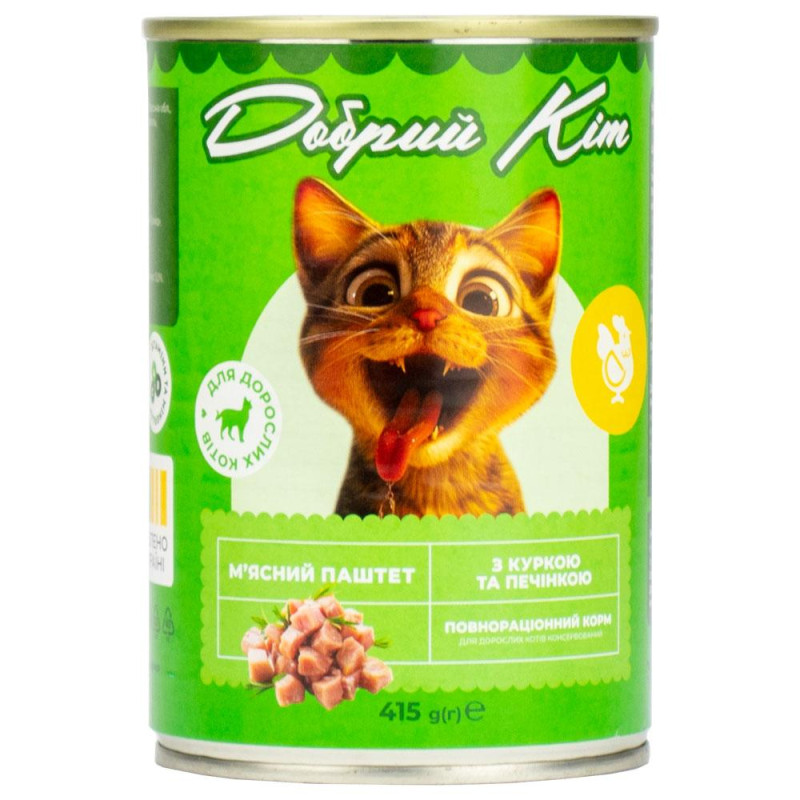 [1]Повнораціонний корм для дорослих котів консервований. М'ясний паштет з куркою та печінкою ТМ «Добрий Кіт».Добрий Кіт - це повноцінне харчування, у складі якого містяться тільки натуральні продукти та велика частина корисних мінералів і вітамінів, що допомагають вашому улюбленцю бути здоровим і задоволеним.Збалансований корм для повноцінного харчування домашніх улюбленців. Велика кількість білка, що міститься в м'ясній складовій, та достатня кількість жиру збагачують організм тварини, надають їй сили та активності протягом цілого дня. Натуральний корм у консервованому вигляді для Вашого улюбленця не містить барвників, ароматизаторів та сої, виготовлений лише з натурального м'яса та м'ясо-продуктів. Готовий для вживання без додаткових зусиль. Рекомендується подавати до вживання корм за температури не нижче кімнатної.Переваги корму:1. Основне джерело білка міститься в м'ясі та м'ясо-продуктах;2. Високий вміст м'ясної складової - не менше 58%;3. відмінне поїдання;4. З мінералами та вітамінами;5. Консистенція корму зручна у використанні та не потребує додаткових зусиль;6. Компоненти корму добре перетравлюються.Склад: м'ясо та продукти тваринного походження не менше 58%* (зокрема з курки - 37%, з яловичини – 14%, печінки - 7%), злаки. Технологічні добавки: гуарова камедь, ксантанова камедь, декстроза. Поживні добавки (на 1 kg (кг) корму): таурин (3a370) - 225 mg (мг); вітамінно-мінеральний комплекс: вітамін D3 (3a671) - 75 IU (МО), вітамін Е (За700) - 22,5 mg (мг), вітамін B1 (3a821) -2,2 mg (мг), вітамін В2 (За825i) – 1,6 mg (мг), вітамін В6 (За831) – 1,2 mg (мг), вітамін В12-11,2 mcg (мкг), ніацинамід (За315) -15 mg (мг), кальцій-D-пантотенат(За841) – 3,7 mg (мг), фолієва кислота (3а316) - 0,4 mg (мг), біотин (3а880) - 30 mcg (мкг); мікроелементи: залізо (3b103) – 13,5 mg (мг), мідь (3b405) -1,0 mg (мг), кремній (Е551а) - 15 mg (мг), цинк (3b605) - 12,5 mg (мг), марганець (3b502) – 1,0 mg (мг), йод (3b202) – 0,22 mg (мг).Енергетична цінність (калорійність) на 100 g (г) корму: 340,0 kJ (кДж) /81,2 kcal (ккал).Поживна цінність (аналітичний склад): сирий протеїн - 7,9%, сирий жир – 5,8%, сира зола – 1,6%, сира клітковина – 0,3%. Вміст вологи: 79,0%.Для дорослих котів усіх порід віком від 1 року.Рекомендації щодо годування: добова норма годування 70 g (г) на 1 kg (кг) ваги тварини. Норма годування може змінюватися залежно від віку, рівня активності та середовища перебування тварини. Порція корму повинна бути кімнатної температури. Свіжа питна вода повинна бути доступна тварині у будь-який час.Умови зберігання закритого корму: зберігати в чистому, добре вентильованому приміщенні за температури від 0°C до +25°С та відносної вологості повітря не вище 75%.Строк придатності: 36 місяців від дати виробництва.Дата виробництва та дата «Вжити до» зазначені на кришці/дні банки. Номер партії (L) відповідає даті виробництва.