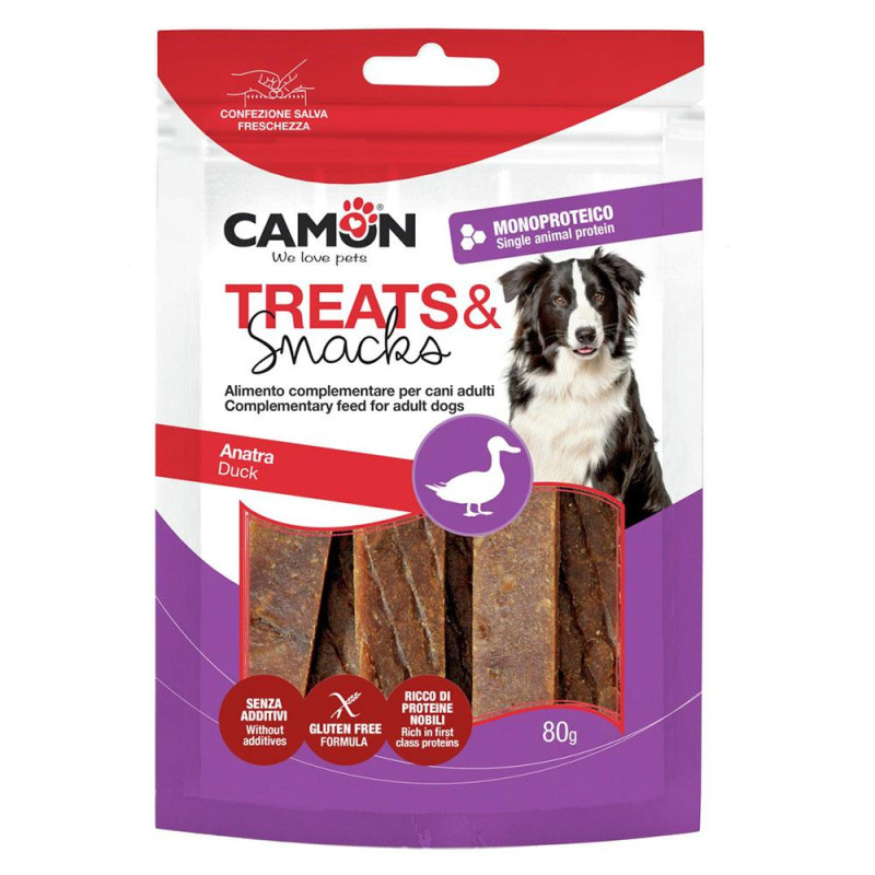 [1] Ласощі м’ясні Camon – В'ялене качине м’ясо, 80 г, смужки 12,5 см (флоупак)Смачні та натуральні ласощі для собак з в’яленого качиного м’яса від італійського бренду Camon. Виготовлені з добірного м’яса качки без додавання штучних барвників і консервантів. Ідеально підходять як заохочення під час дресирування або як апетитний перекус між основними прийомами їжі.Переваги:Високий вміст м’яса – джерело білка тваринного походженняПриємна текстура: м’які смужки довжиною 12,5 смБез глютену та цукруЗручна упаковка-флоупак для збереження свіжостіСклад: качине м’ясо, мінеральні речовини, рослинні білкиМаса нетто: 80 гРекомендовано для: собак усіх порід і розмірівСклад: м’ясо качки 88,5%, кукурудзяний крохмаль, рослинний гліцерин, сорбітол, хлорид натрію. Аналітичний склад: сирий протеїн 29,1%, сира клітковина 0,7%, сирий жир 2,2%, сира зола 3,4%, волога 17,1%. Рекомендації щодо годування: Давайте дорослим собакам від 2 до 10 шт. на день залежно від розміру вашого собаки. Щодня давайте чисту, свіжу воду. Термін придатності та номер партії дивіться на упаковці.
