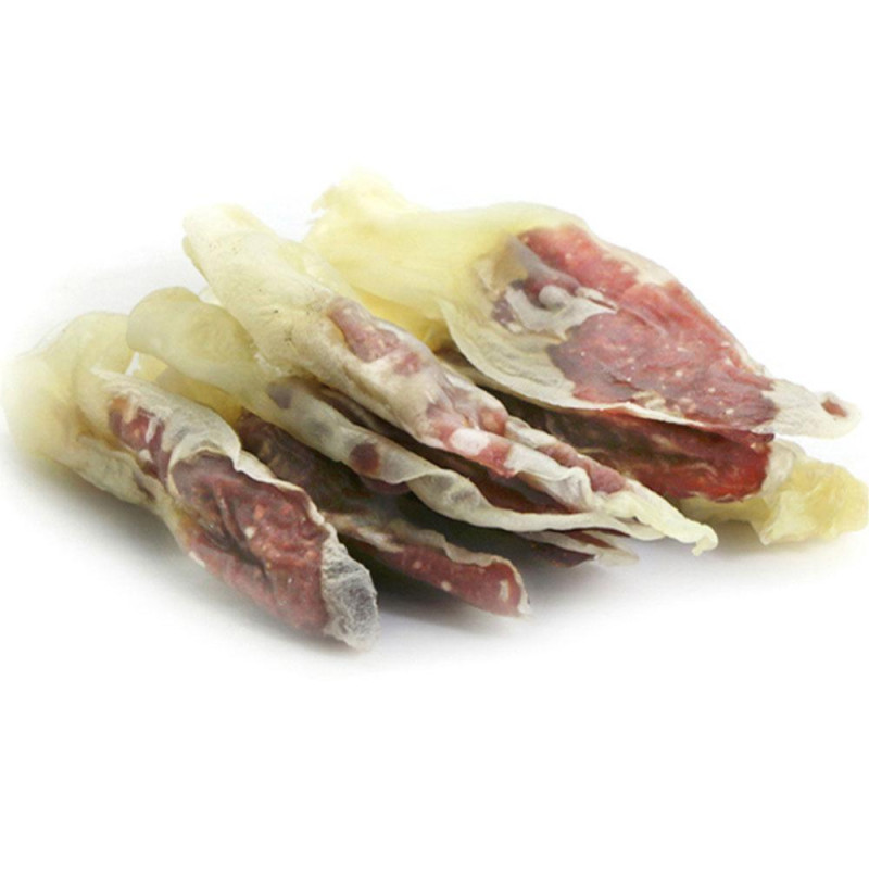 Склад: качка 40,4%, гліцерин 4,5%, сорбіт 0,8%, крохмаль 10%, арахісовий білок 3%, гороховий білок 2%, сіль 0,2%, кроляче вухо 39,1%.Аналіз: білки 34%, жири 3%, зола 4,5%, клітковина 1%, волога 18%.