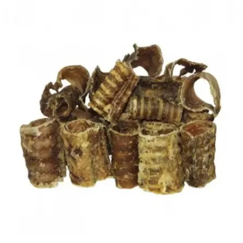 М'ясні ласощі для собак - це спосіб порадувати і заохотити вихованця за хорошу поведінку або виконану команду. Делікатеси мають становити не більше 8-10% добового раціону. Це натуральний продукт, приготований за особливою технологією: із сировини видаляють воду, але водночас зберігають усі корисні речовини. Пропонуючи улюбленцю ласощі слід враховувати вік тварини, породу, стать, стан здоров'я та індивідуальні потреби.Натуральні сушені ласощі - корисна добавка до раціону. Завдяки щільній структурі вони відмінно очищають і зміцнюють зуби і ясна собак, задовольняють інстинкт жування.Сушена трахея чудово підходить для собак усіх порід, а особливо для цуценят у період зміни зубів. Рекомендується регулярно включати її в раціон улюбленців з м'язистими щелепами. Продукт очищений від жиру, залишків м'яса і судин, має привабливий для собак запах, легко жується, не травмуючи ротову порожнину і органи шлунково-кишкового тракту навіть у 3-місячних цуценят.Ласощі містять:білок, необхідний для росту і зміцнення м'язів;фосфор, що нормалізує вуглеводний обмін;залізо, необхідне для кровотворення, насичення тканин киснем;цинк, важливий для нормального росту і розвитку ендокринної системи.Продукт рекомендується для підгодівлі собак у період росту та вагітностіПідходять для собак усіх порід.Без додавання штучних ароматизаторів, барвників та консервантів."
