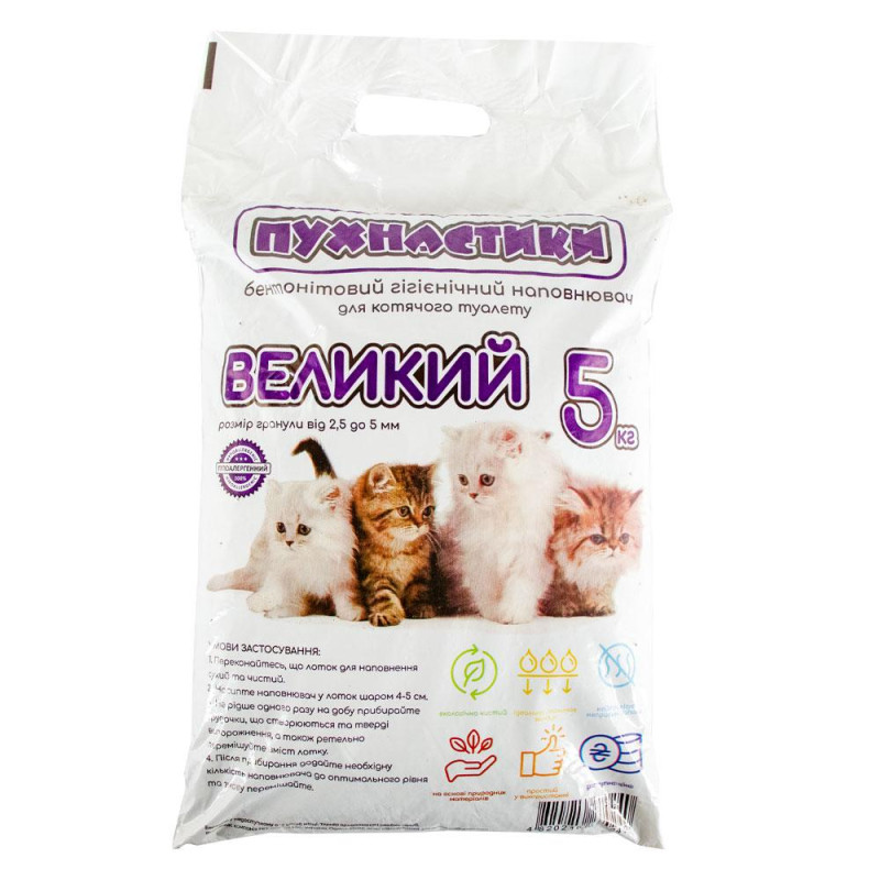 [1]Натуральний бентонітовий наповнювач для котячого туалету. Має чудові поглинаючі властивості і при цьому забезпечує максимальне поглинання неприємних запахів.Переваги:Виготовлений із природного сорбенту – 100% натуральної, ретельно просіяної глини, обробленої за високого температурного режиму.Являє собою суміш дрібних і середніх гранул пористої структури, що забезпечує наповнювачу гарну поглинання та ефективне поглинання запахівМає антибактеріальний ефект, завдяки чому туалет вихованця захищений від неконтрольованого розмноження патогенних мікроорганізмів.Не викликає алергії у свійських тварин та їх власників, тому що не містить сторонніх хімічних домішок.Утворює дуже міцні грудки, практично не припадає пилом і не прилипає до лапок кішки.Відрізняється невеликою витратою, потрібно лише замінити грудочки, що утворилися, свіжим наповнювачем, а не міняти його повністюБез будь-яких добавок та ароматизаторів, на дотик і по запаху максимально відповідає уявленню кішок про те, яким має бути їх “природний туалет”Розмір гранул – 2,5 – 5 ммНасипте в котячий туалет наповнювач шаром не менше 5 см. Завжди насипайте наповнювач лише у сухий лотокЩодня діставайте совком грудки, що утворилися, і викидайте їх у відро для сміття.Для того, щоб заповнити вміст туалету, не потрібно змінювати весь наповнювач, додайте лише його необхідну кількістьПовністю міняти наповнювач рекомендується приблизно раз на місяць (за умови утримання в будинку однієї кішки)Слідкуйте, щоб товщина шару наповнювача завжди становила 5 см.Не допускайте потрапляння наповнювача до каналізаційної системиКількість котячих туалетів у будинку має відповідати кількості кішок, що у ньому проживає. В ідеалі до цієї кількості про всяк випадок повинен додаватися ще один запасний туалет із наповнювачем