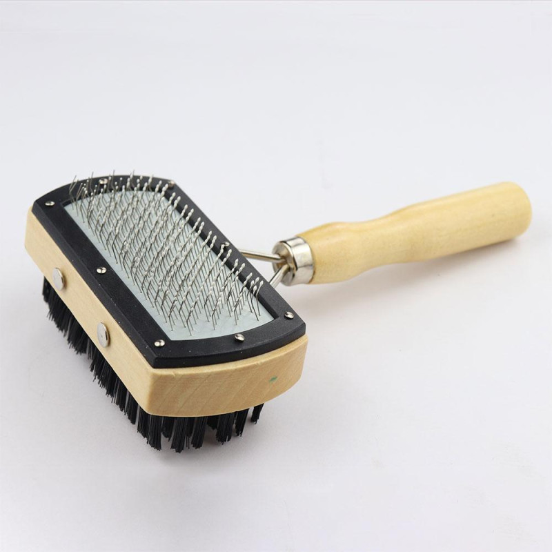[1]Пуходерка-щітка Пухнастики двостороння з напиленням 2в1 з дерев'яною ручкою, 10 х17 см - підтримує красу та гігієну вашого вихованця.Універсальна двостороння пуходерка-щітка для собак. Видаляє стару шерсть і бруд, надає шерсті чистий і здоровий вигляд.Щітку можна використовувати для розподілу живильної косметики для шерсті вашого улюбленця і для повного чищення.З одного боку щітка має металеві зубці і виконує роль пуходерки.З іншого боку має штучну щетину і використовується як щітка.