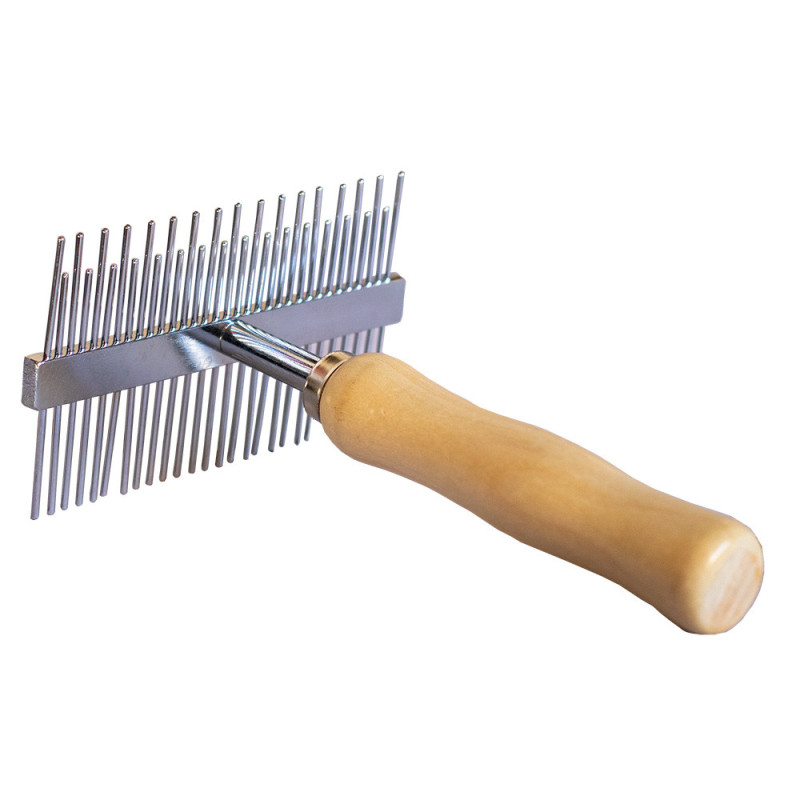 [1]Зручний гребінець-граблі Пухнастики двосторонній з одним рядам металевих зубців для розчісування та розплутування ковтунів у собак та котів із середньою та довгою шерстю.Допомагає дбайливо розчісувати шерсть тварини, розділяючи волоски між собою, що дає змогу ефективно розплутувати ковтуни У разі щоденного використання запобігає сплутуванню шерсті та поліпшує кровообіг у клітинах шкіриюОснащений заокругленими зубцями з хромованої нержавіючої сталі, аби не травмувати шкіру та не спричиняти дискомфорт тварині під час вичісування.Найкраще підходить для вичісування тварин із середньою та довгою шерстю.Дерев'яна ручка забезпечує зручне утримання інструмента в руці.
