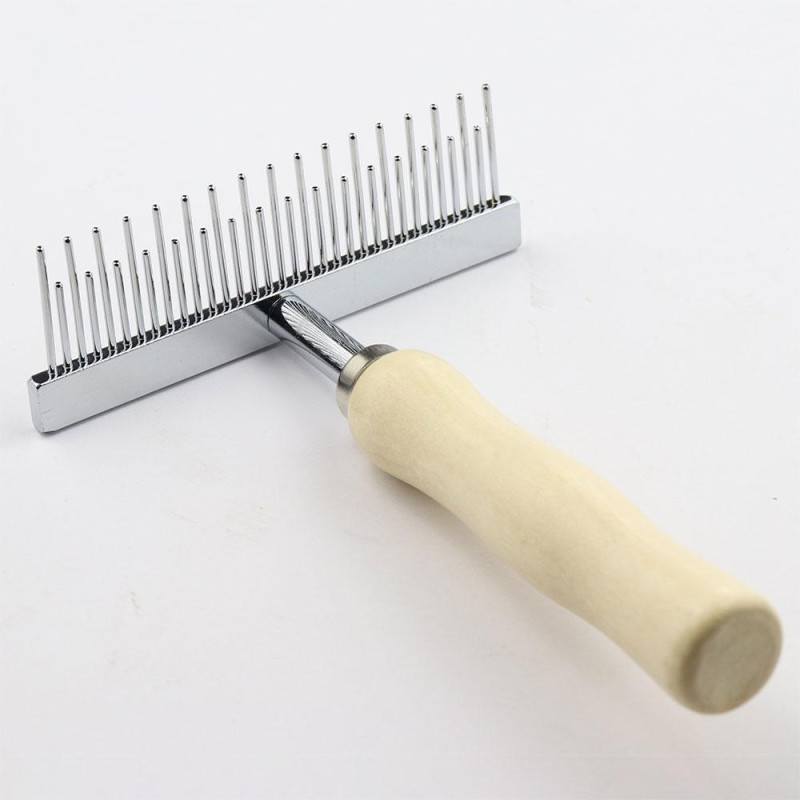 [1]Зручний гребінець-граблі Пухнастики Різний зуб з одним рядам металевих зубців для розчісування та розплутування ковтунів у собак та котів із середньою та довгою шерстю.Допомагає дбайливо розчісувати шерсть тварини, розділяючи волоски між собою, що дає змогу ефективно розплутувати ковтуни У разі щоденного використання запобігає сплутуванню шерсті та поліпшує кровообіг у клітинах шкіриюОснащений заокругленими зубцями з хромованої нержавіючої сталі, аби не травмувати шкіру та не спричиняти дискомфорт тварині під час вичісування.Найкраще підходить для вичісування тварин із середньою та довгою шерстю.Дерев'яна ручка забезпечує зручне утримання інструмента в руці.