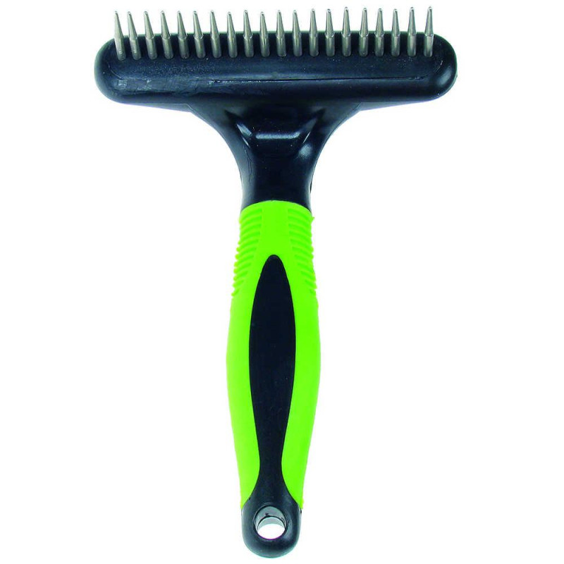 [1]Гребінець-граблі однорядні для собак і котів TatraPet Expert, 5х16х5 cмДопомагає дбайливо розчісувати шерсть тварини, розділяючи волоски між собою, що дає змогу ефективно розплутувати ковтуниЗа щоденного використання запобігає сплутуванню шерсті та покращує кровообіг у клітинах шкіриОснащений закругленими зубцями з хромованої неіржавкої сталі, щоб не травмувати шкіру і не завдавати дискомфорту тварині під час вичісуванняНайкраще підходить для вичісування тварин із середньою та довгою шерстюПластикова ручка забезпечує зручне утримання інструменту в руці