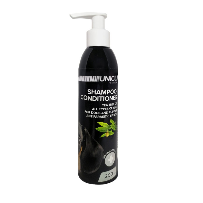 Шампунь-кондиціонер UNICUM premium для собак із маслом чайного дерева. Використання чайного дерева, масло за дуже короткий термін може підсушити рану, а також має загоювальний ефект.