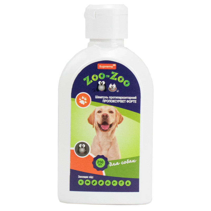 Шампунь протипаразитарний ПРОПОКСУРВЕТ ФОРТЕШампунь ZOO-ZOO для собак належить до комбінованих інсекто-акарицидних препаратів для зовнішнього застосування. Фармакологічні властивості препарату зумовлені властивостями діючих речовин.Профілактика та лікування собак і котів за хвороб, спричинених ектопаразитами: блохами, вошами, паразитоформними кліщами на імагінальній, німфальній та личинковій стадіях розвиткуСклад:1 мл препарату містить діючі речовини:пропоксуp — 1,5 мг;пірипроксифен — 0,1 мг.Допоміжні речовини: розчин суміші поверхнево-активних речовин.Застосування:Лікування та профілактика собак, котів, декоративних гризунів при:ентомозах, що спричинені блохами (Ctenocephalides canis/felis), вошами (Trichodectes canis, Felicola subrostratus), волосоїдами (Linognathus setosus);акарозах, що спричинені іксодовими кліщами (Dermacentor spp., Rhipicephalus spp., Ixodes spp.), хейлетіозними кліщами (Cheyletiella spp.);на імагінальный та личинкової стадії розвитку членистоногих, а також для захисту тварин від нападу двокрилих комах: комарів (Culicidae), ґедзів (Tabanidae), мошок (Simuliidae), мокреців (Ceratopogonidae), личинок м’ясних і синантропних мух (Muscidae).Дозування:Перед обробкою шкірно-волосяний покрив тварин ретельно змочують теплою водою і наносять шампунь розрахунком 1 мл на 1 кг маси тіла тварини, розподіляючи його по всій поверхні тіла, злегка втирають до утворення піни. Через 5–10 хвилин шампунь змивають теплою водою.При необхідності обробку повторюють (1 раз на 4–7 діб). У профілактичних цілях використовують один раз у 3 місяці. У разі повторної появи паразитів необхідно проконсультуватися з ветеринарним лікарем.Протипоказання:Не використовувати хворим та ослабленим тваринам. При ознаках подразнення шкіри слід припинити обробку тварини та звернутися до лікаря ветеринарної медицини. Не застосовувати вагітним та лактуючим тваринам, а також тваринам з підвищеною чутливістю до компонентів препарату. Уникати контакту з очима. У разі потрапляння шампуню в очі негайно промити великою кількістю води.Зберігання:Сухе, захищене від прямого сонячного проміння місце, окремо від харчових продуктів, кормів та напоїв, при температурі від +5 °C до +30 °C.Термін придатності в закритому упакуванні — 2 роки.Тільки для ветеринарного застосування!