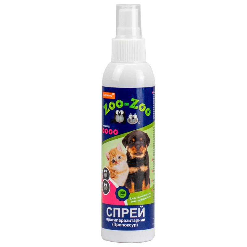 [1]Спрей протипаразитарний (розчин для зовнішнього застосування, спрей)● Склад:100 мл препарату містить діючу речовину (мг): пропоксур – 300.Допоміжні речовини: олія лимону ефірна, пропіленгліколь-400, гліцерин, спирт ізопропіловий.● Застосування:Профілактика та лікування собак, котів і декоративних гризунів при захворюваннях, спричинених ектопаразитами: блохами (Ctenocephalides spp., Pulex irritans), волосоїдами (Trichodectes canis, Felicola subrostratus), кліщами (Linognathus setosus), Demodex spp., Sarcoptes scabiei та інші паразити на личинкових і дорослих стадіях розвитку.● Дозування:Обробку тварин проводять на відкритому просторі або у добре вентильованих приміщеннях. Для попередження злизування препарату щелепи тварин фіксують петлею або на шию вдягають "захисний комірець". Перед застосуванням флакон струшують, натискучи на розпилювальну головку флакона, направляють струмінь на тулуб тварини з відстані 10–20 см та тушують проти росту шерсті протягом декількох секунд, зволожуючи шерсть до шкіри. Прикриваючи очі тварини, обробляють вуха, шию, груди, живіт і хвіст.Рекомендована доза препарату становить 1 мл (5 натискань) на 1 кг маси тіла тварини. Постійні обробки проводять за показаннями, але не частіше 1–2 разів на тиждень.● Протипоказання:Не застосовувати тваринам віком до 6 тижнів.Не використовувати хворим, виснаженим та старим тваринам!Не застосовувати тваринам з підвищеною чутливістю до складників препарату.Не застосовувати самкам під час вагітності та лактації!Не застосовувати одночасно з іншими інсектоакарицидними препаратами.● Застереження:При роботі з препаратом необхідно користуватися гумовими рукавицями і ватно-марлевими пов’язками. Під час обробки тварин не можна палити, пити і приймати їжу. При випадковому потраплянні препарату на шкіру або слизові оболонки його слід негайно змити великою кількістю води. Після обробки тварин необхідно: вимити обличчя і руки, рот прополоскати; гумові рукавиці висушити та вимити. Забороняється користуватися препаратом біля відкритого вогню.● Зберігання:Зберігати препарат у сухому темному місці, недоступному для дітей та тварин, подалі від харчових продуктів при температурі від 3°С до 30°С.Термін придатності: 3 роки.