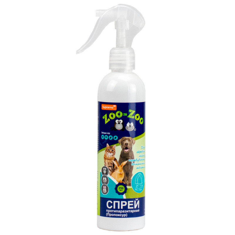[1]Спрей протипаразитарний (розчин для зовнішнього застосування, спрей)● Склад:100 мл препарату містить діючу речовину (мг): пропоксур – 300.Допоміжні речовини: олія лимону ефірна, пропіленгліколь-400, гліцерин, спирт ізопропіловий.● Застосування:Препарат застосовувати для обробки місць перебування тварин та засобів догляду за ними. Спрей викликає загибель ектопаразитів:бліх (Ctenocephalides spp., Pulex irritans),волосоїдів (Trichodectes canis, Felicola subrostratus),вошей (Linognathus setosus),паразитарних кліщів (Ixodes spp., Dermacentor spp., Rhipicephalus spp.),а також на личинковій і мінімальній стадіях розвитку.● Дозування:Обробку місць перебування тварин (вольєри, клітки, будки, підстилки та інші) проводити при добрій вентиляції.Перед застосуванням флакон струсити і, натискаючи на розпилювальну головку флакона, направити струмінь спрею з відстані 10–20 см на оброблювану поверхню до легкого зволоження.Повторні обробки проводити не частіше 1–2 разів на тиждень.● Протипоказання:Підвищена чутливість до складників препарату.Не застосовувати у присутності тварин.● Застереження:Тварин необхідно обробляти відповідними інсекто-акарицидними препаратами. При роботі з препаратом необхідно користуватися гумовими рукавицями і ватно-марлевими пов'язками.Під час застосування спрею не можна палити, пити і приймати їжу. При випадковому потраплянні препарату на шкіру або слизові оболонки його слід негайно змити великою кількістю води. Після обробки тварин необхідно вимити лице і руки, рот прополоскати; вимити і просушити руки та рукавиці. Забороняється користуватися препаратом біля відкритого вогню.● Зберігання:Зберігати препарат у сухому недоступному для дітей та тварин місці, окремо від харчових продуктів та кормів за температури від 10 до 25 °C.● Термін придатності: 3 роки.Тільки для ветеринарного застосування!