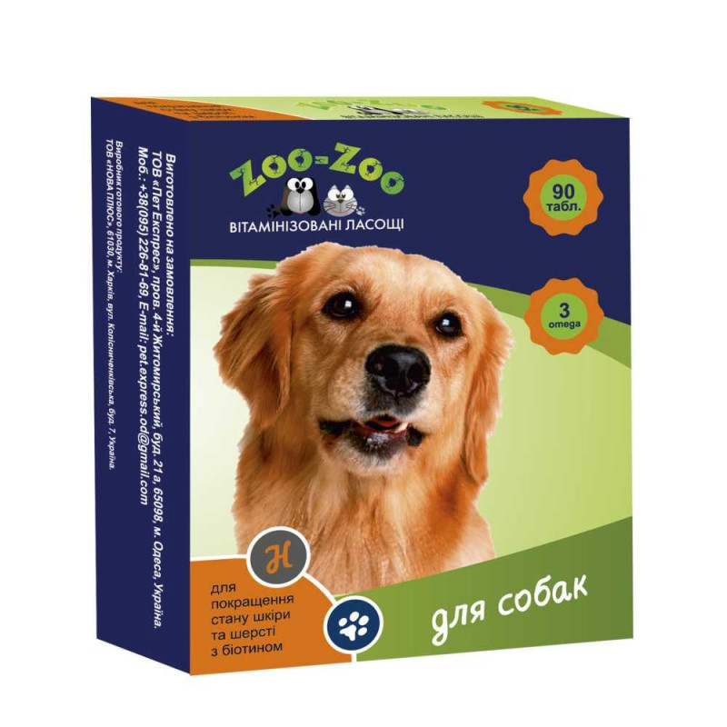 [1]Вітамінізовані ласощі для собак Zoo-Zoo 90 табл/уп (для шкіри та шерсті)Вітамінізовані ласощі ZOO-ZOO — це прекрасний спосіб для поповнення організму вашого вихованця корисними вітамінами та поживними речовинами та поліпшення його настрою.Регулярне вживання вітамінізованих ласощів із біотином для шкіри та шерсті собак ZOO-ZOO (а особливо під час годування натуральною) сприяє поліпшенню стану шерсті та шкіри, зміцненню імунітету. Вітамінізовані ласощі з біотином необхідні тваринам у період линяння для якнайшвидшого відновлення шорсткого покриву, особливо в зимовий період.Вітамінізовані ласощі для собак ZOO-ZOO виготовлені на основі рослинних компонентів у процесі кріодеструкції. Принцип цієї унікальної технології полягає в розкритті клітинної мембрани рослинної клітини під впливом низьких температур ( -196 °C), що сприяє збереженню максимальної кількості біологічно активних речовин і практично унеможливлює з руйнування.Склад: біотин, гранат, хлорела, пробіотики, омега- 3 кислоти, екстракт харчових дріжджів, вітамінно-мінеральний комплекс.В 1 таблетці Вітамінізованих ласощів для собак ZOO-ZOO міститься: протеїну не менш ніж 12%, жиру не менш ніж 1%, кальцію не менш ніж 0,4%, фосфору не менш ніж 0,5%, Омега-3 не менш ніж 3 мг, біотину 5 мкг.Склад: біотин, гранат, хлорела, пробіотики, омега- 3 кислоти, екстракт харчових дріжджів, вітамінно-мінеральний комплекс.В 1 таблетці Вітамінізованих ласощів для собак ZOO-ZOO міститься: протеїну не менш ніж 12%, жиру не менш ніж 1%, кальцію не менш ніж 0,4%, фосфору не менш ніж 0,5%, Омега-3 не менш ніж 3 мг, біотину 5 мкг.